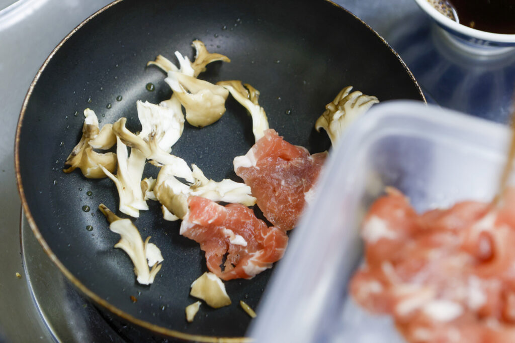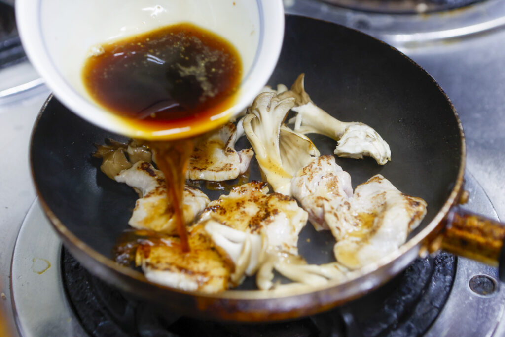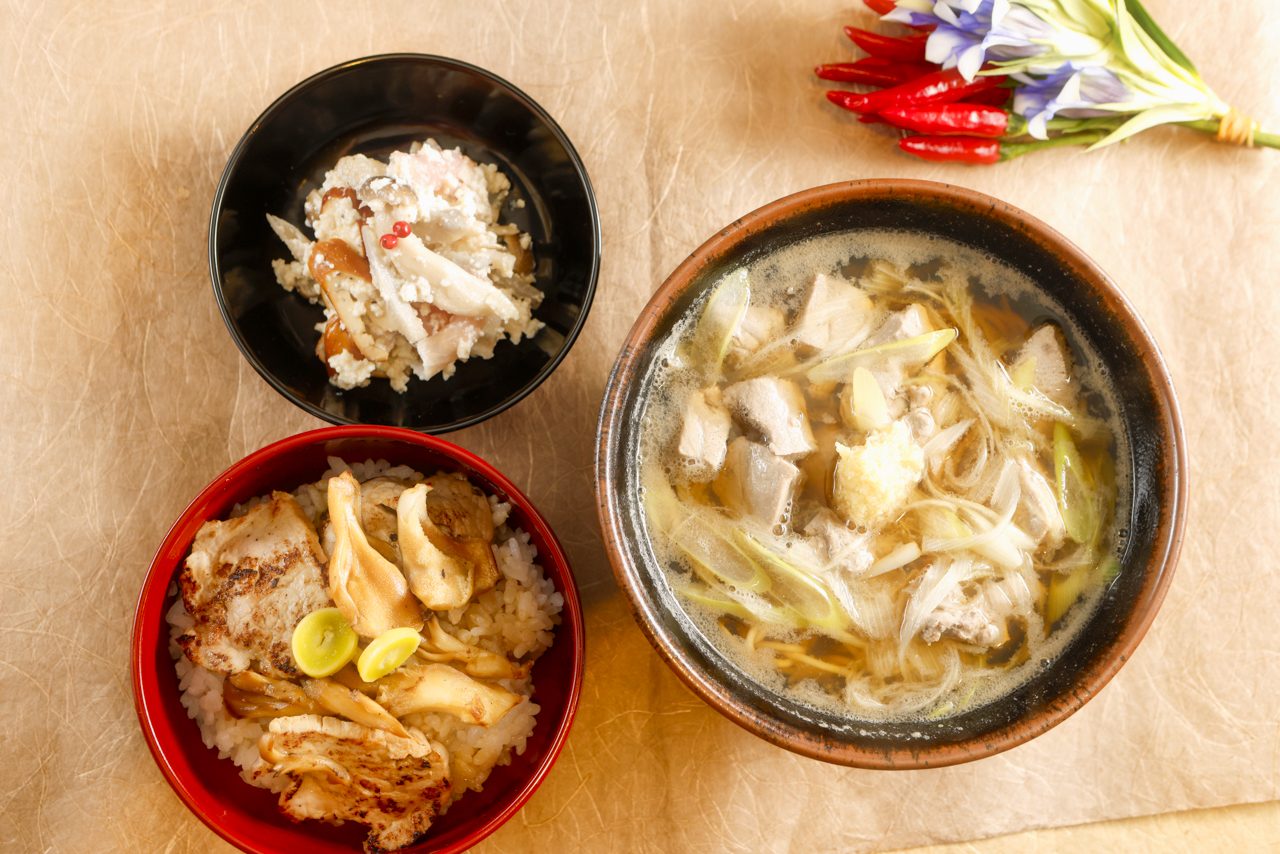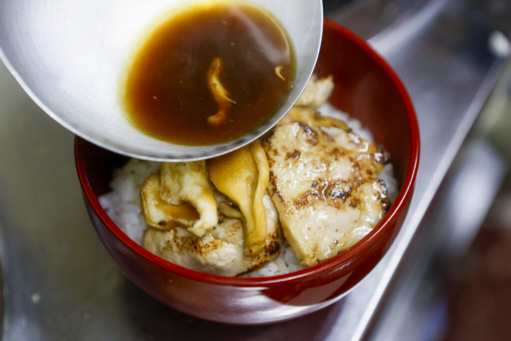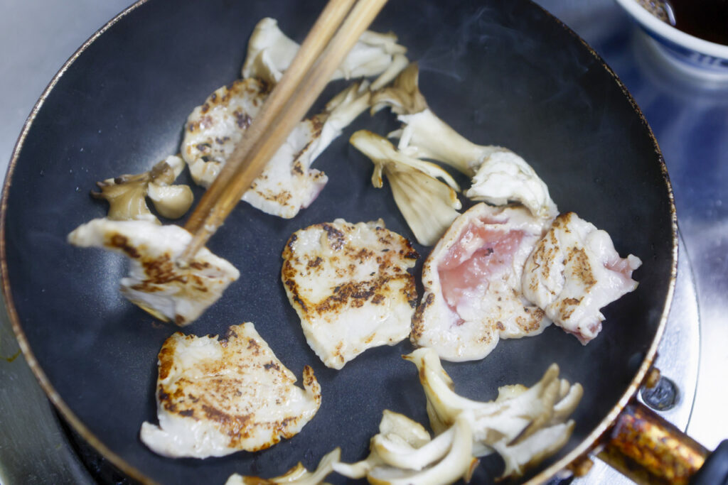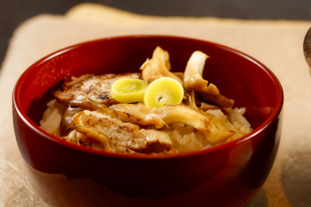 今年も使います。蕎麦に魚を用いましたので御飯はお肉でバランスをとります。塩麹に漬け込んだ豚ヘレを木の子と共に焼いて、タレに絡めた甘辛い丼です。