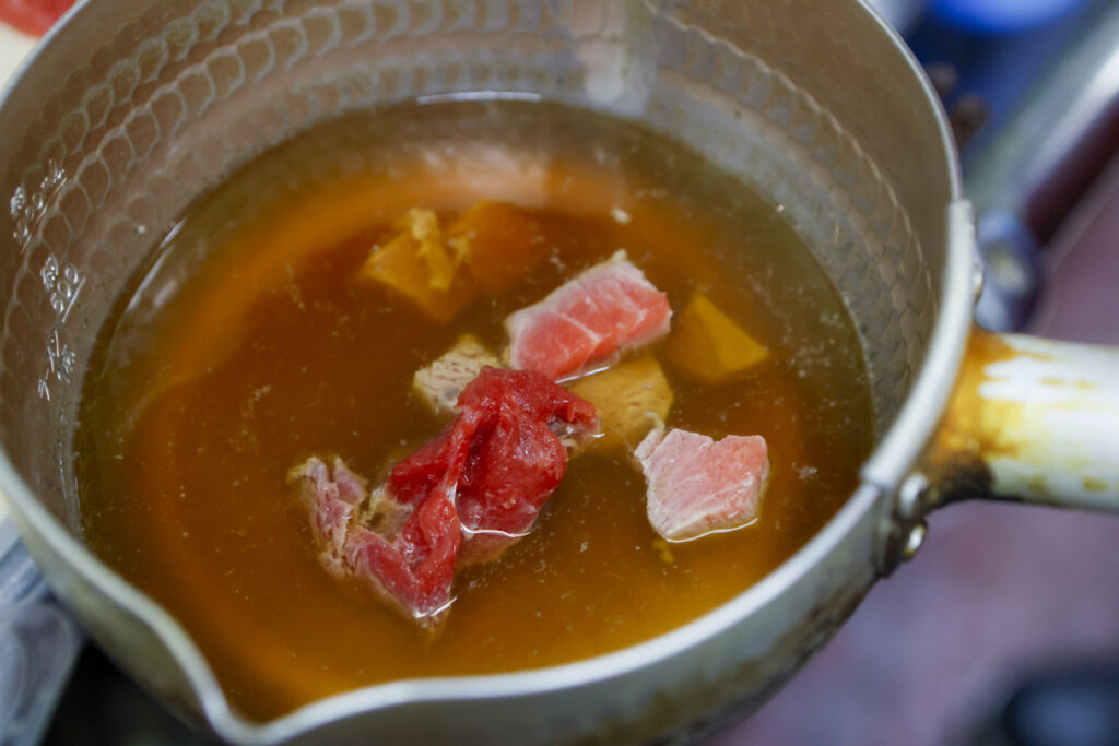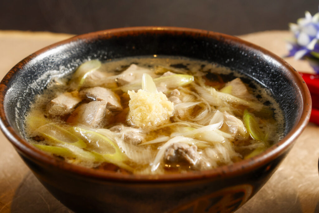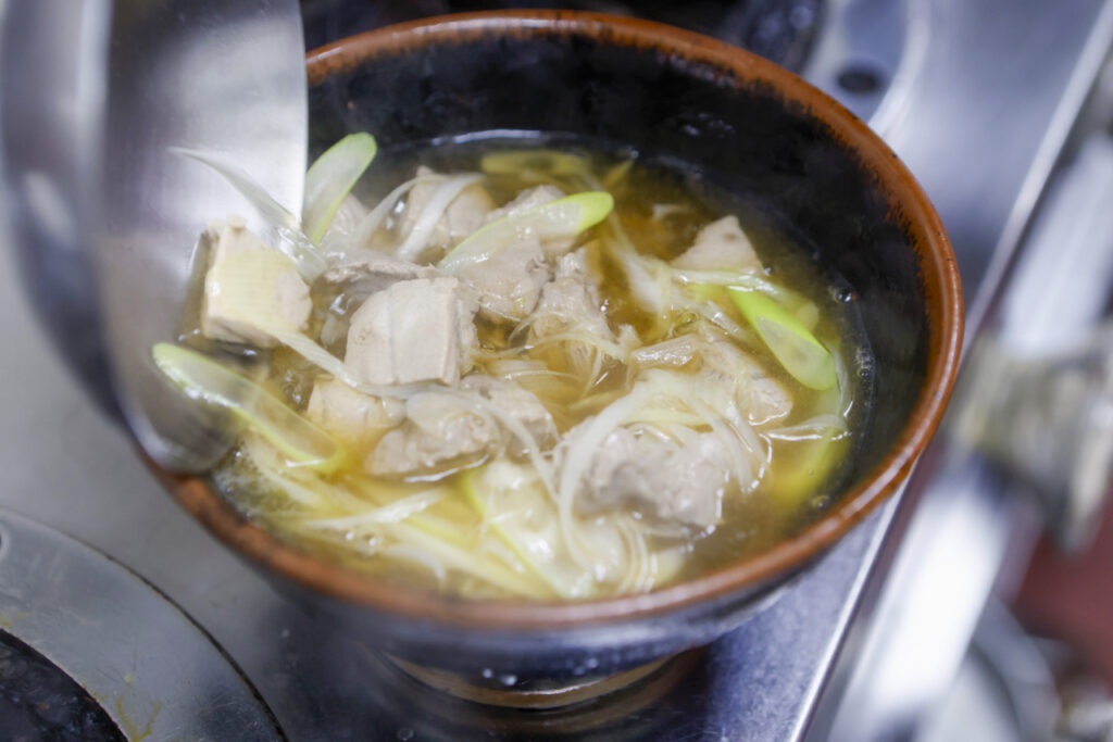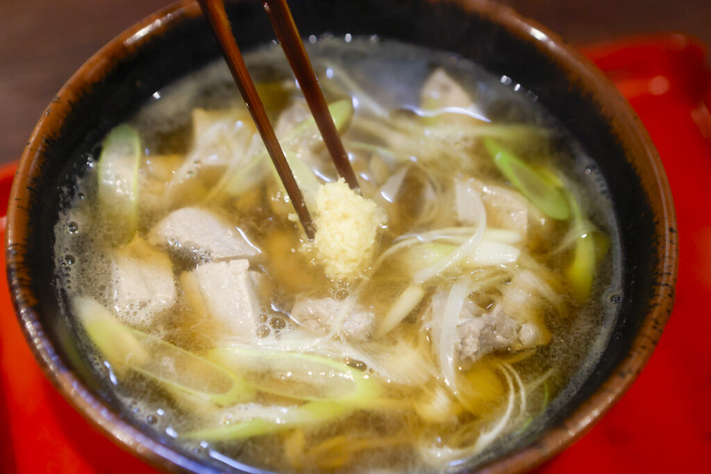 毎日市場から鮪のすき身を仕入れていますので、色んな部位が入っていると思います。スジの部分も火が通りますと柔らかくなりますし、トロの脂も鰹出汁に溶けて相乗効果が生まれます。ネギの甘さも相まってホント良い種物です天のおろし生姜は今回は必須アイテムです。