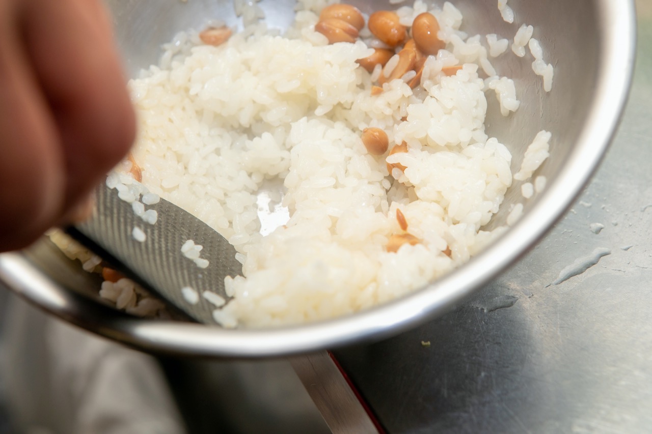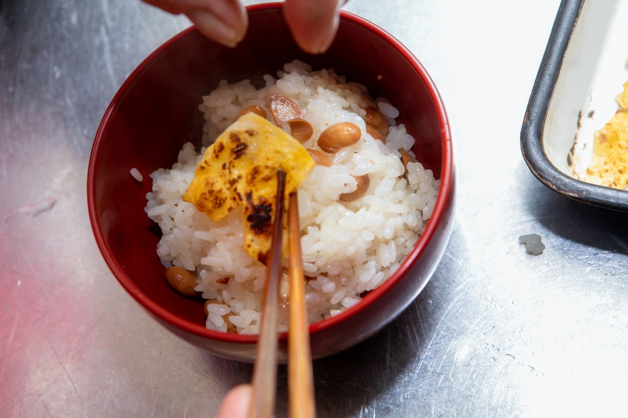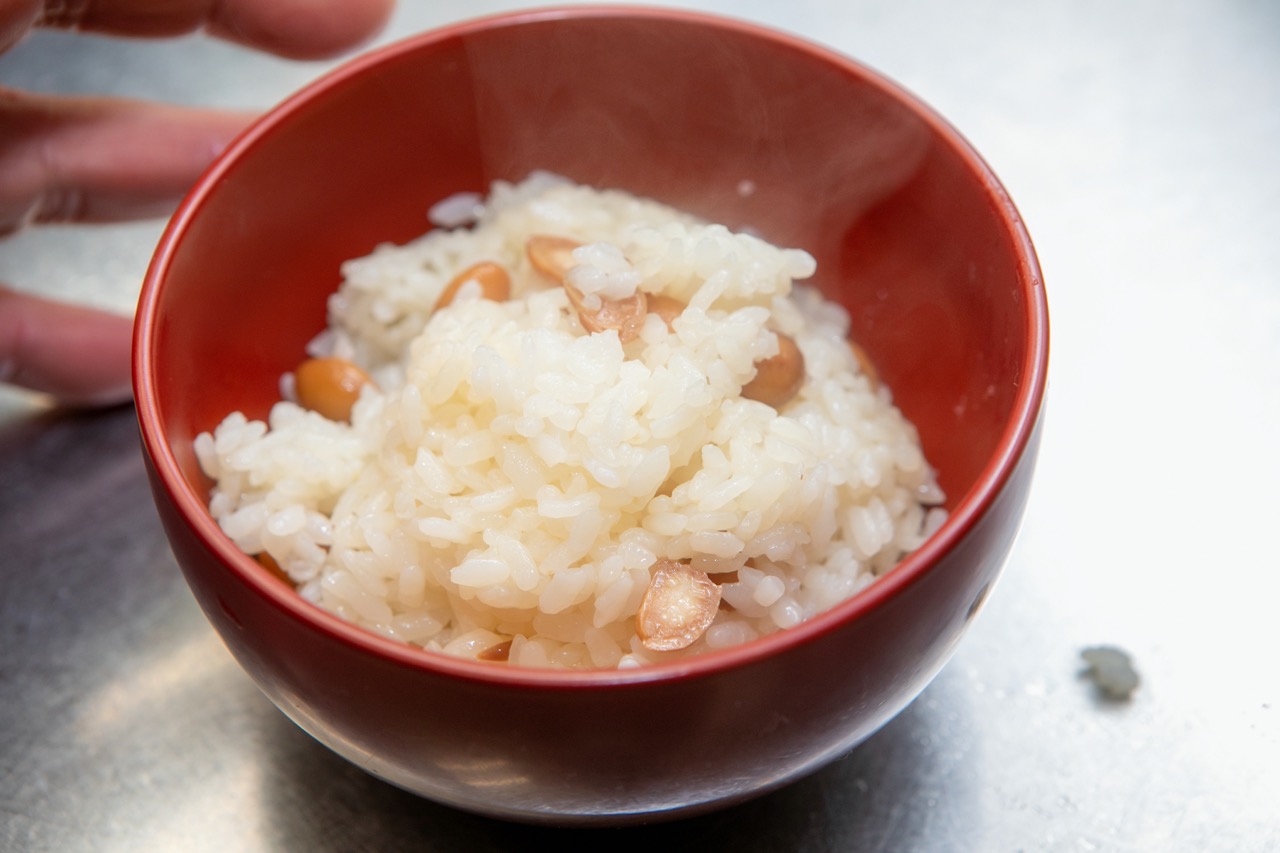 国産炒り大豆を出汁で炊いて味付けし、ご飯と混ぜてあります。