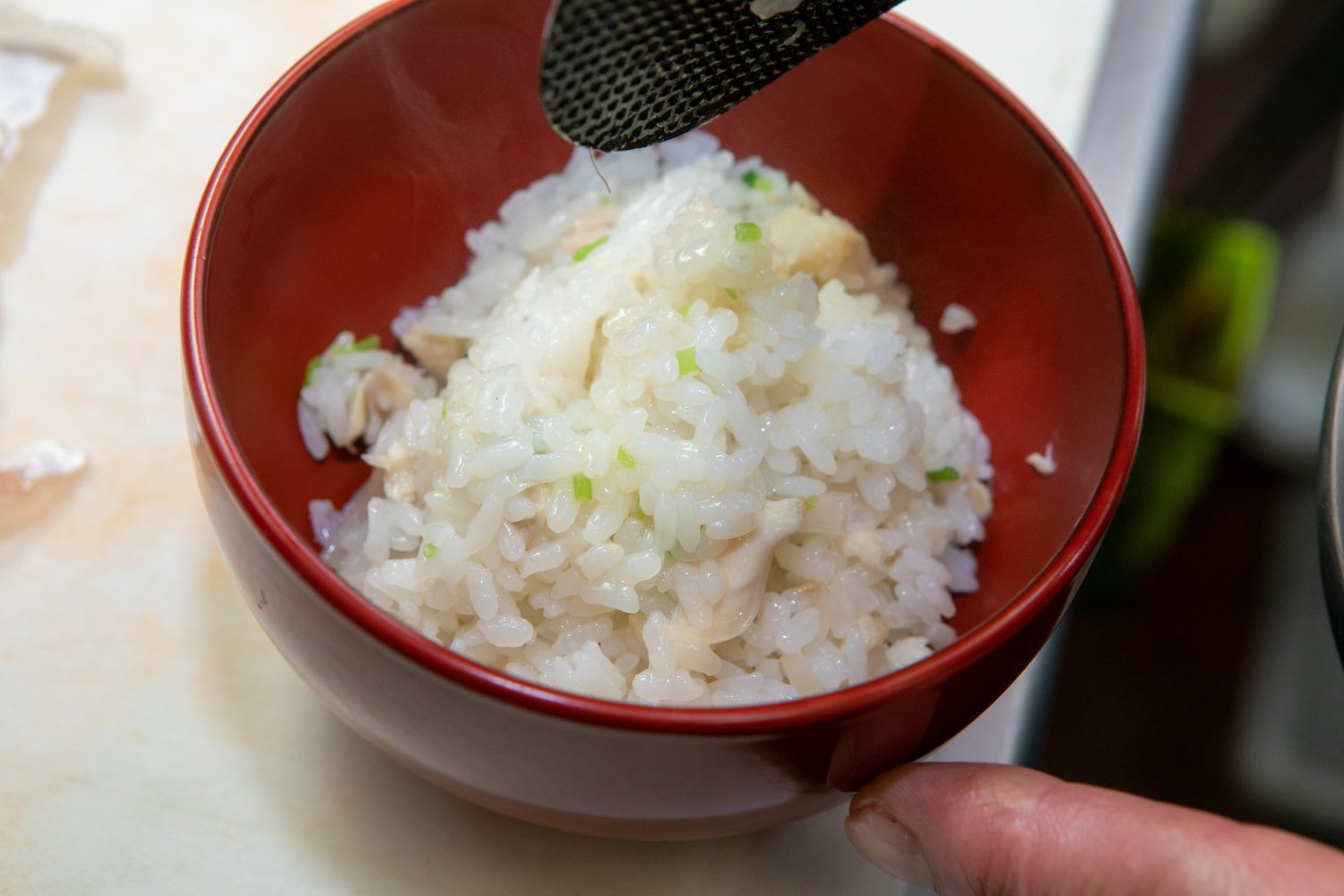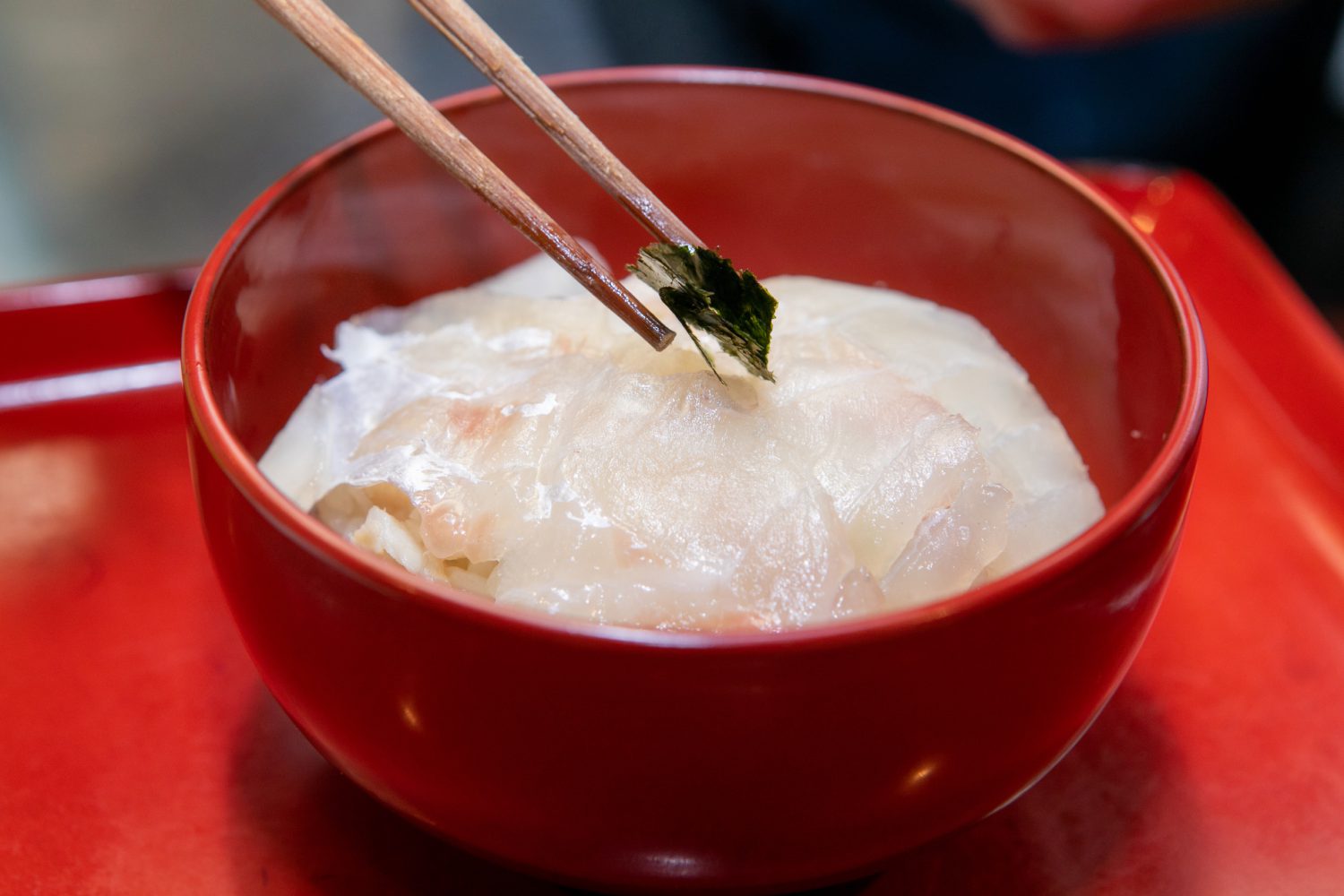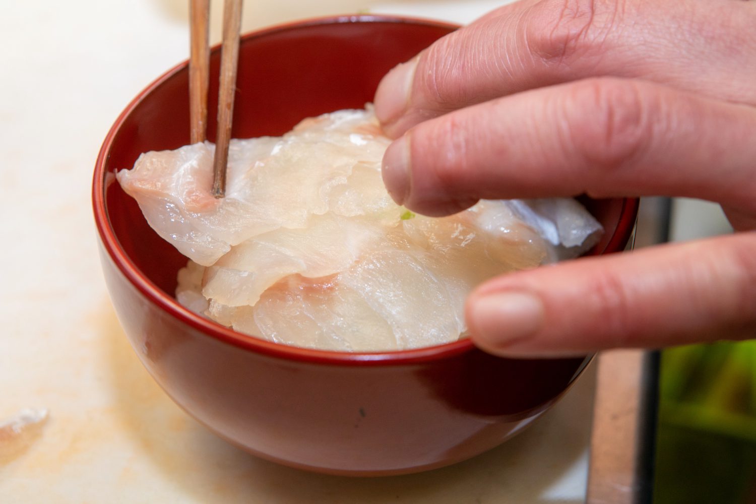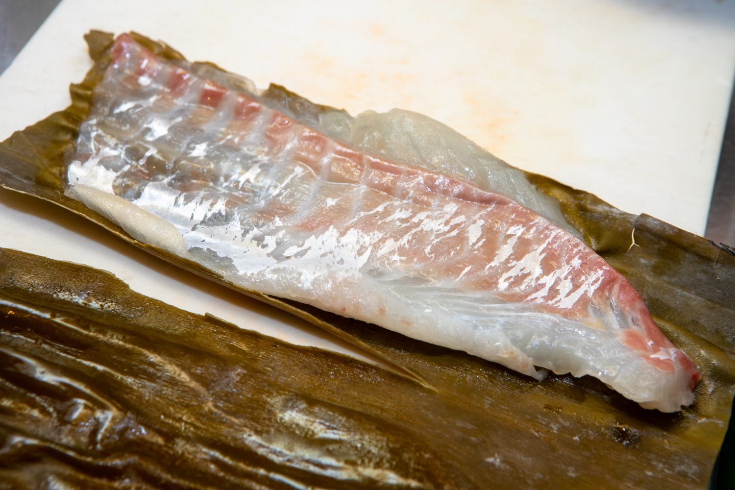 焼き浸しにした身を混ぜた味付け御飯の上に昆布締めした切身を、薄く削ぎ切りにして並べました。割にほっこりする味に仕上がっていると思います。天には、もみ焼き海苔です。